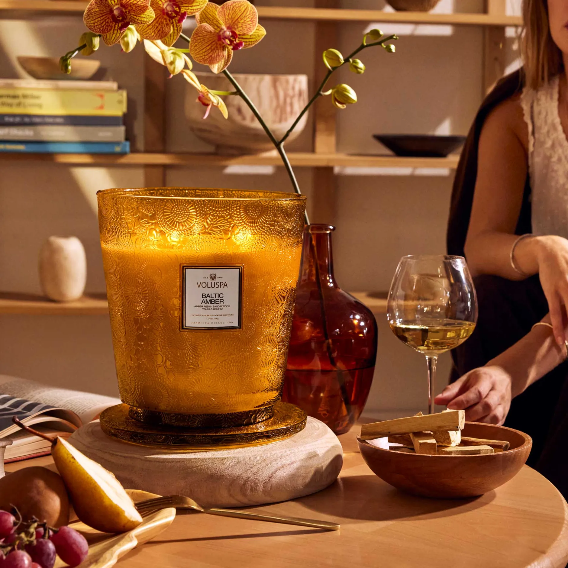 Warm up the ambiance with a sensual soirée of honeyed Amber Resin, velvety Woods and the rich incense of smoldering Vanilla Orchid. Bask in the swoon-worthy golden glow that radiates lingering warmth. Fall under Baltic Amber’s spell and prepare to be enchanted…