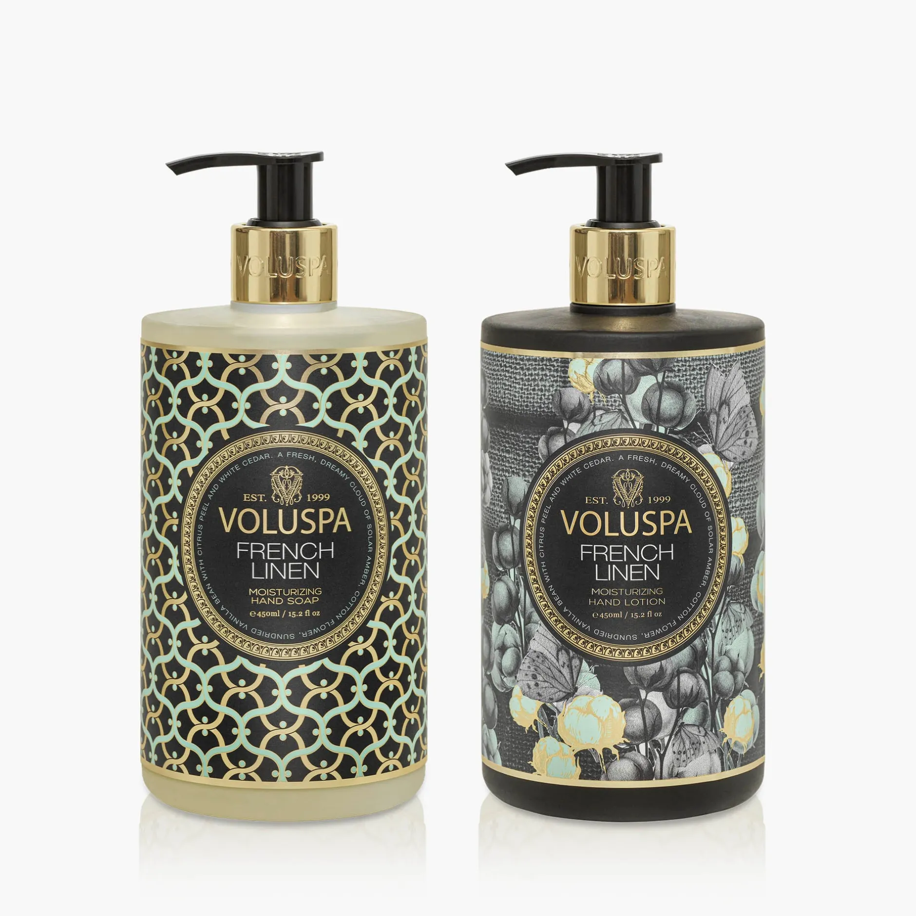 Voluspa’s Moisturizing Hand Soap is highly covetable with its elegant frosted soft-touch finished bottle, wrapped in classic black or white Maison artwork. Pops of distinctive secondary color highlights are coupled with accents of muted gold. An added touch of luxury is also present in the custom logo, embossed on chrome gold collars on all bottle necks. Each bottle is custom designed in-house and created with Post-Consumer Recycled material. The perfect balance of beauty and function, from our house to your home. Voluspa’s Moisturizing Hand Lotion is highly covetable with its elegant frosted soft-touch finished bottle, wrapped in classic black or white Maison artwork. Pops of distinctive secondary color highlights are coupled with accents of muted gold. An added touch of luxury is also present in the custom logo, embossed on chrome gold collars on all bottle necks. Each bottle is custom designed in-house and created with Post-Consumer Recycled material. The perfect balance of beauty and function, from our house to your home.