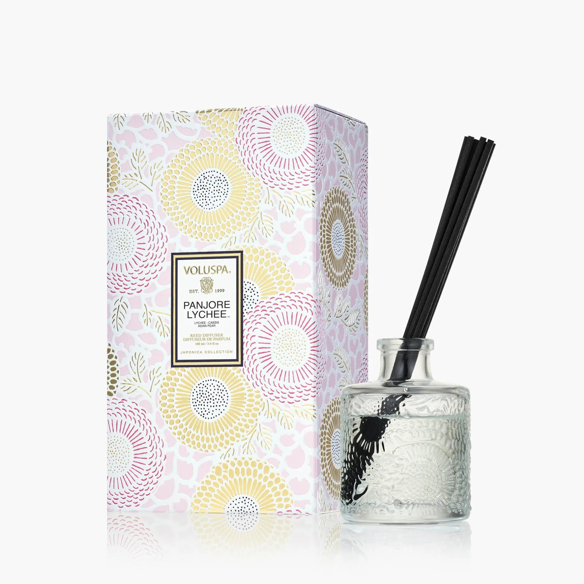 Voluspa’s fragrant diffuser oil is housed in an embossed glass vessel for a subtle pop of elegant decor. Create your homes signature, always-on fragrance in spaces requiring minimal effort, and enjoy for 2-4 months. Includes high absorbency reeds for powerful fragrance without overwhelming.