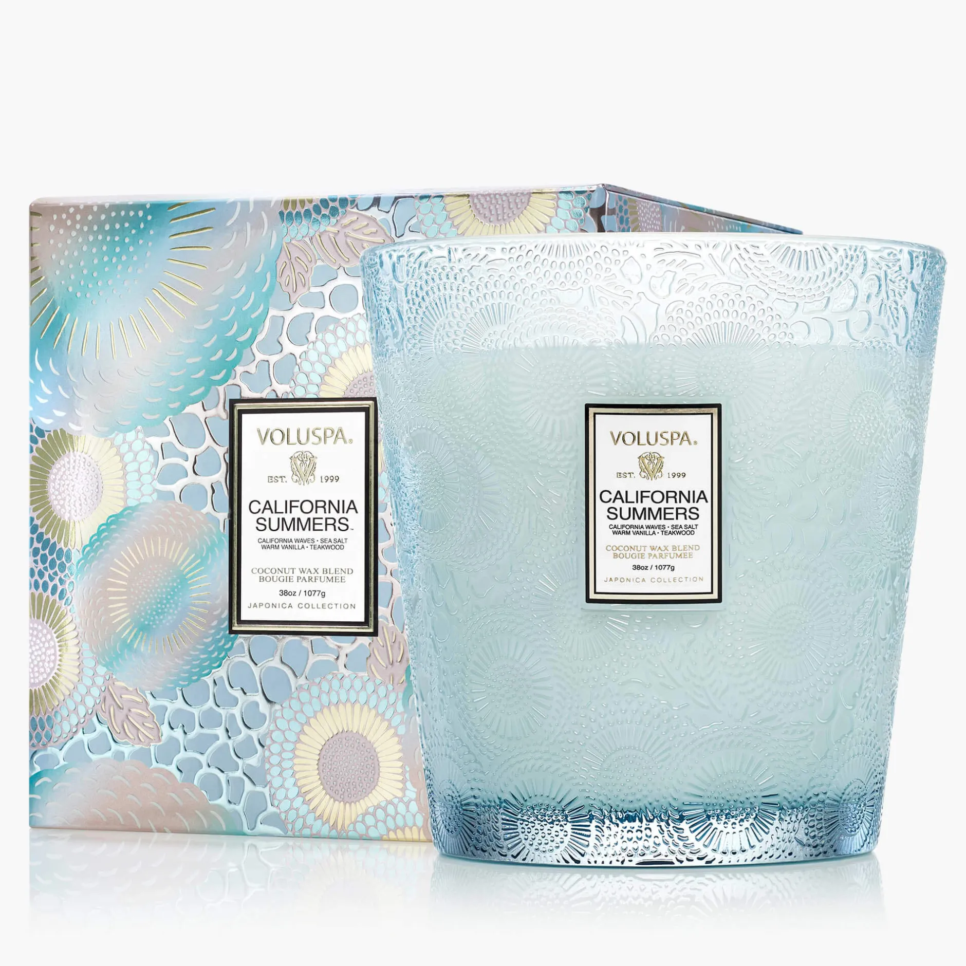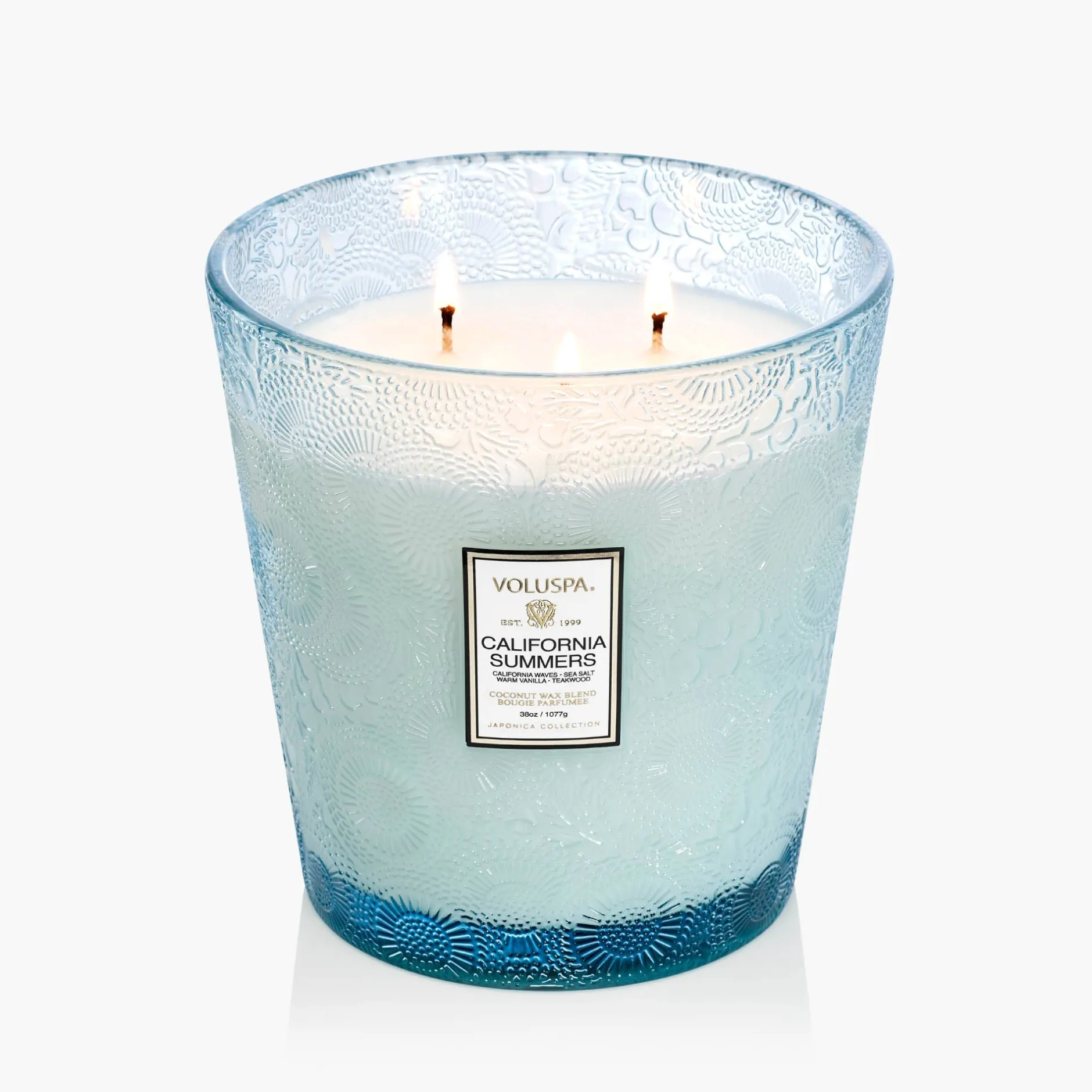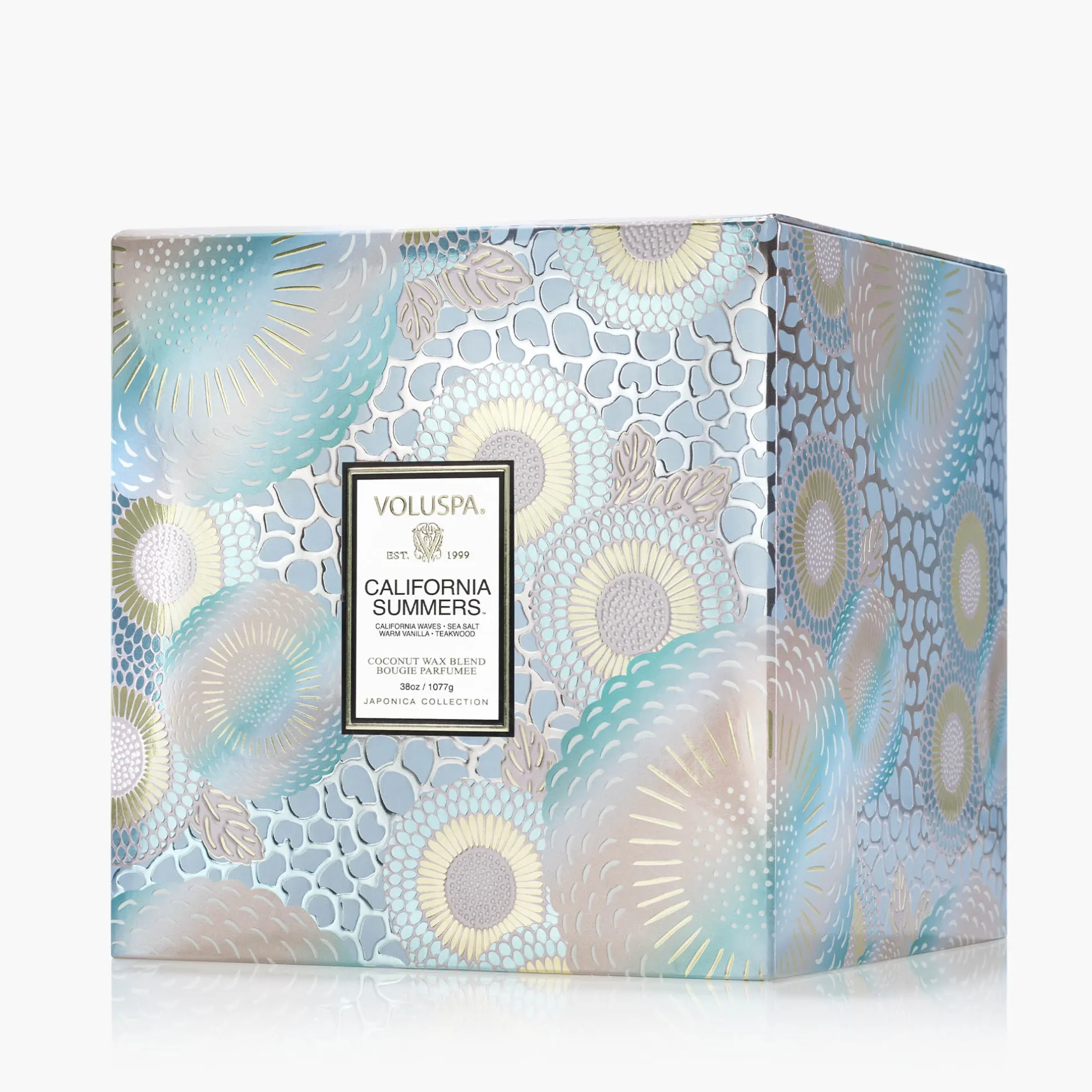 Plunge into the blue horizon and escape into another realm, where worries are reduced to coasting on hypnotic rolling waves. A salty ocean breeze tickles the skin as the sun reaches its peak height of the day, leaving you to bask in a teakwood sling chair, lathered in a tonic of warm vanilla and coconut milk. Welcome in the rising tides to wash away the cares of the day. Voluspa invites you to take the scenic route, so you may always return for California Summers.