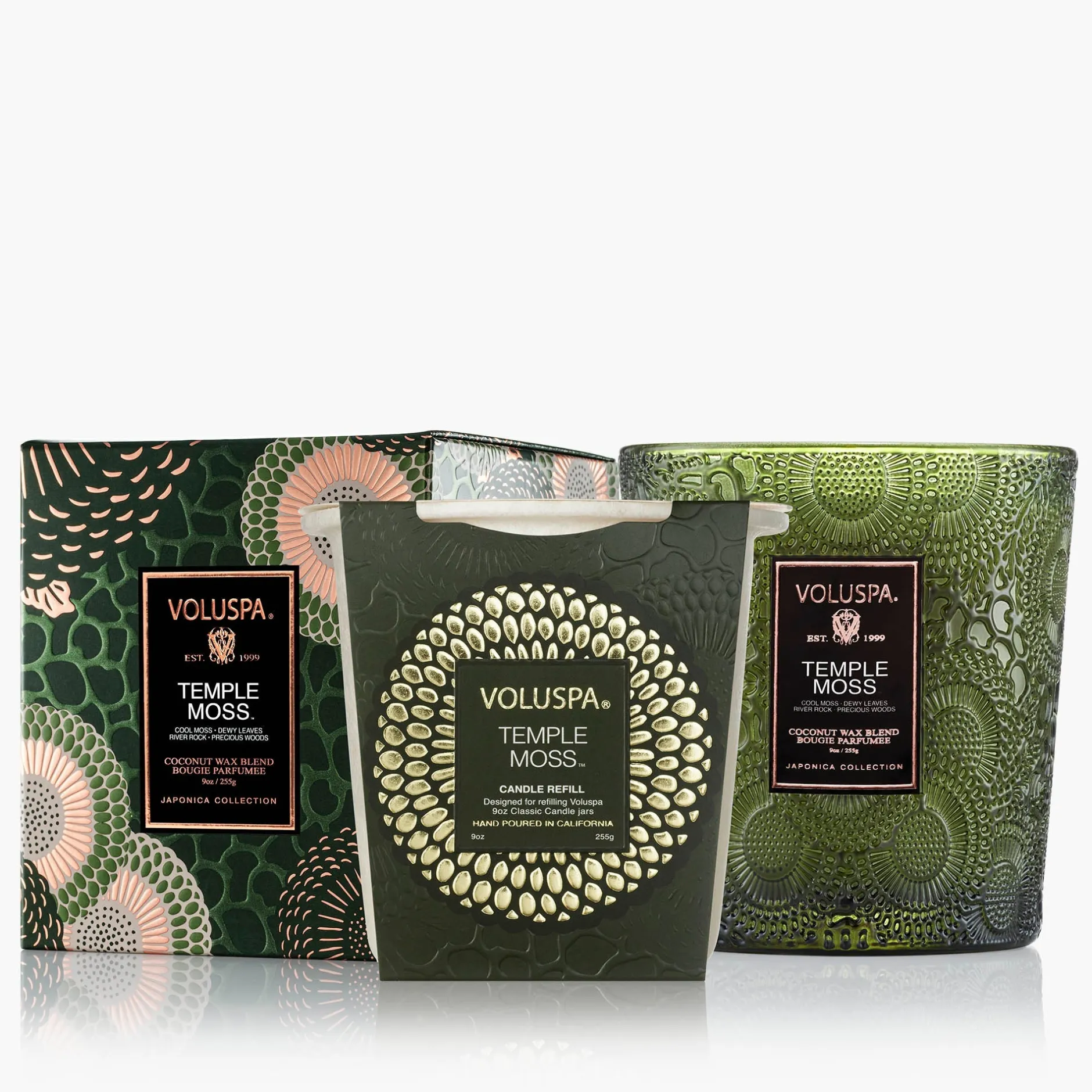 Voluspa invites you to seek solace in the forest floor. Ground down in the healing notes of cool moss, dewy leaves, wet stones and warm sun peeking through the thicket of Hinoki branches. The Master Perfumer herself, Mother Nature, will guide you to tranquility through rhythmic sights, sounds andscents of her lush forest. All are welcome to wander the aromatic grounds of Temple Moss.