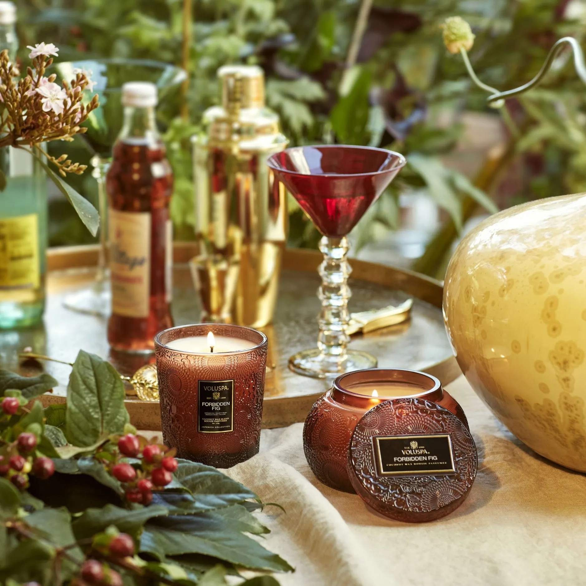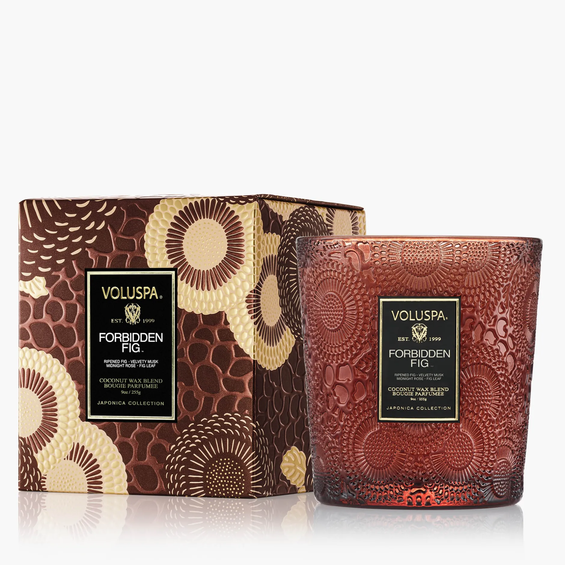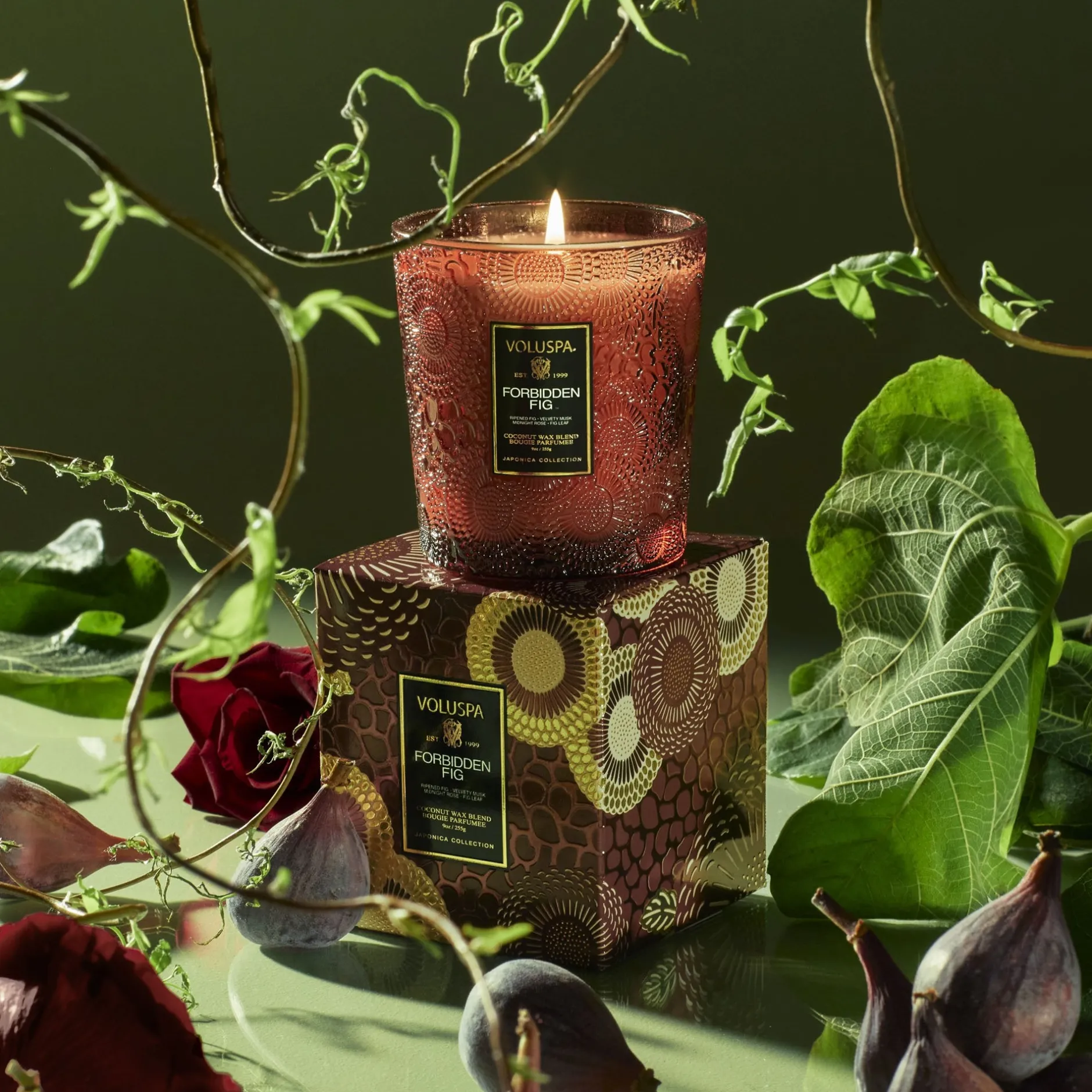 Unearth the pure magnificence of the wild fig tree. Rooted down in the dry sun-drenched soil, smooth white bark unfolds with fragrant facets of lush green leaves. This matriarch of the orchard is crowned with succulent dark fruits, filled with coveted sweet nectar and armed with sophisticated woody stalks. The rustling wind sweeps up the essence of plump wild berries and fallen crushed leaves, leaving you with an aromatic fragrance so sweet and alluring that it earns its name – Forbidden Fig.