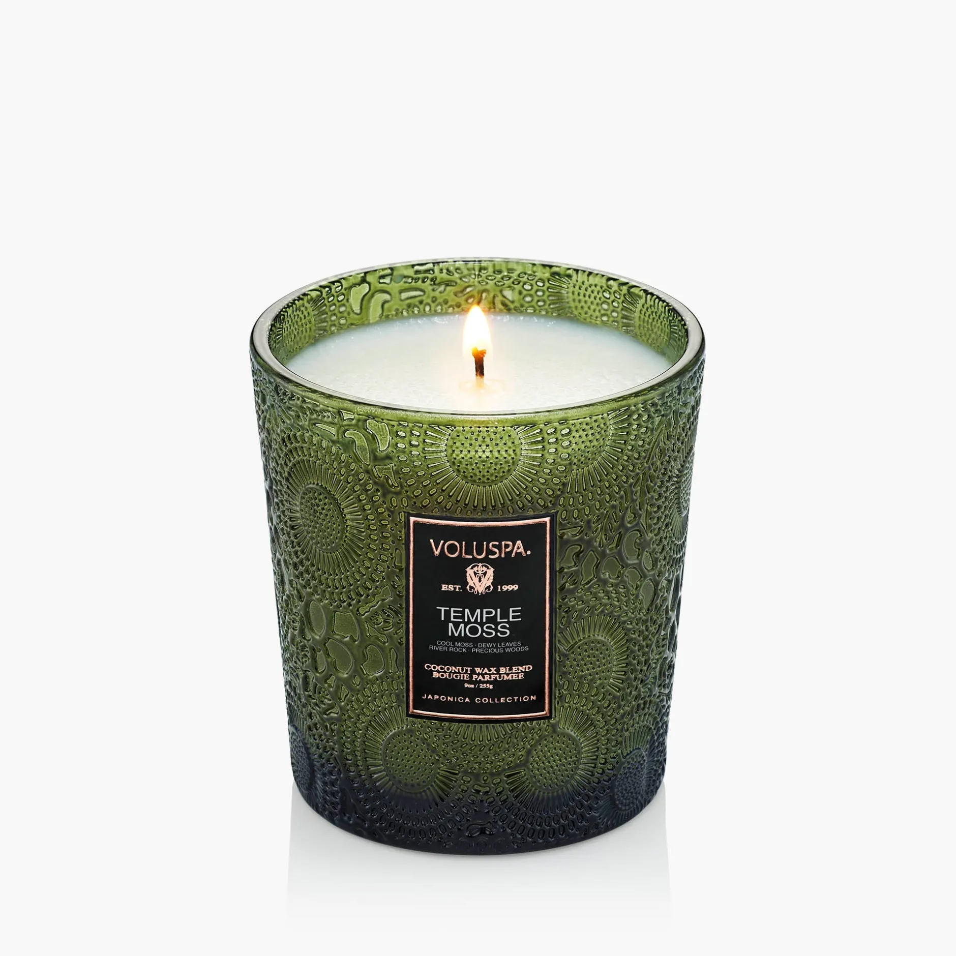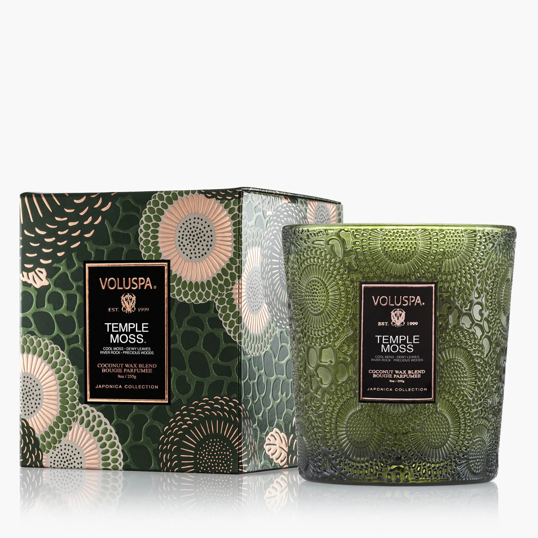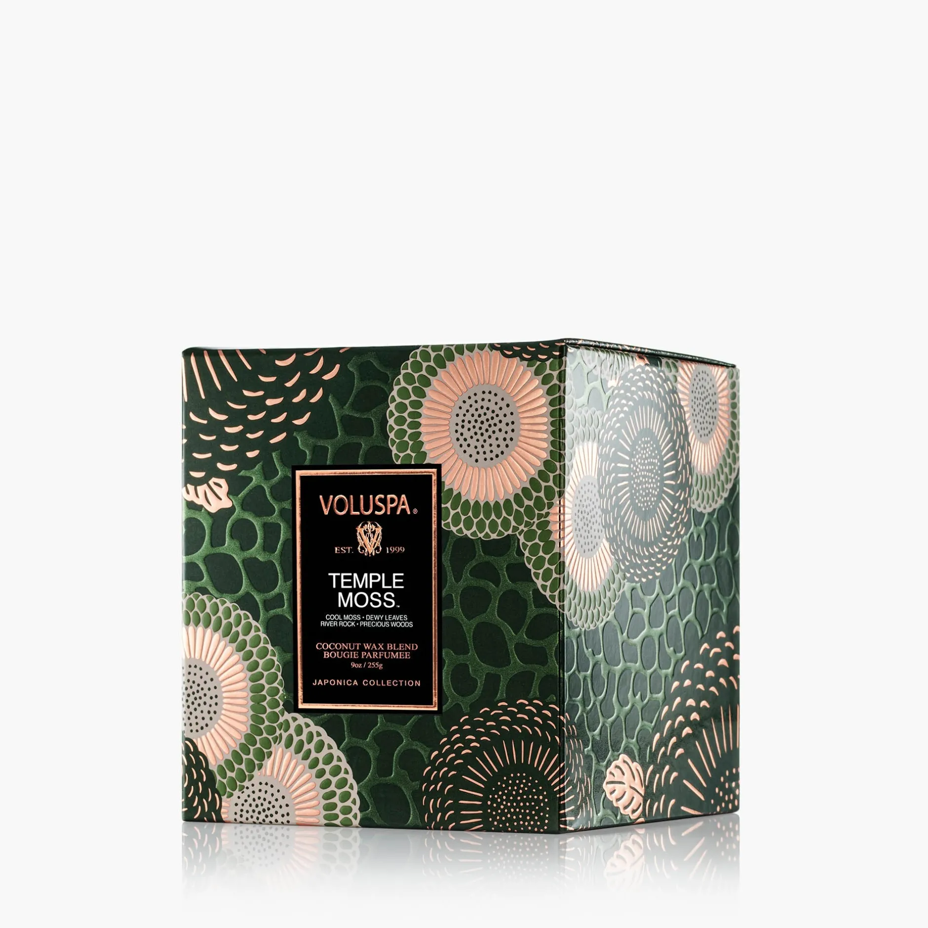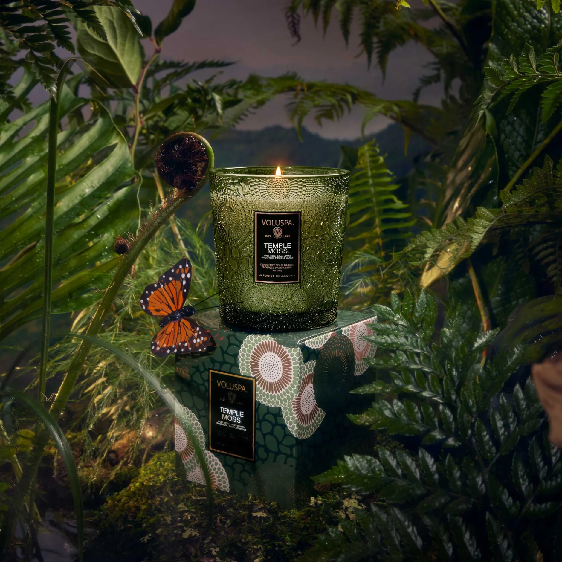 Voluspa invites you to seek solace in the forest floor. Ground down in the healing notes of cool moss, dewy leaves, wet stones and warm sun peeking through the thicket of Hinoki branches. The Master Perfumer herself, Mother Nature, will guide you to tranquility through rhythmic sights, sounds andscents of her lush forest. All are welcome to wander the aromatic grounds of Temple Moss.