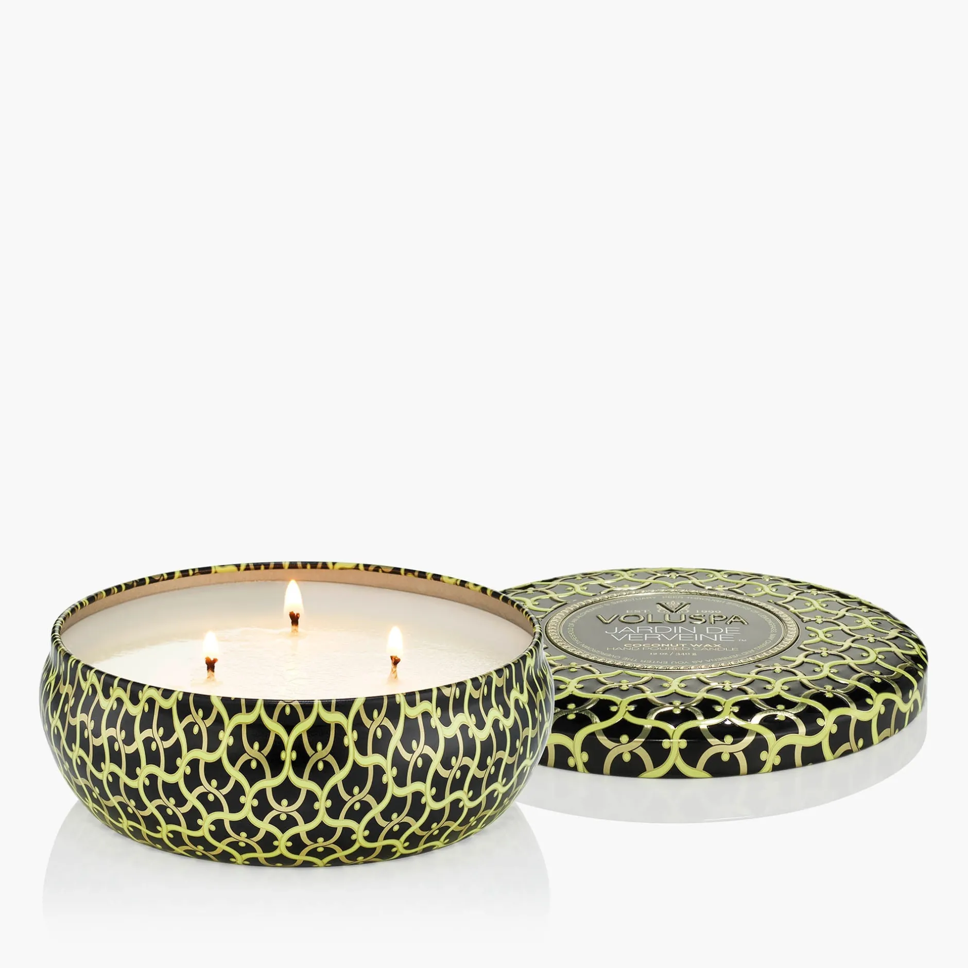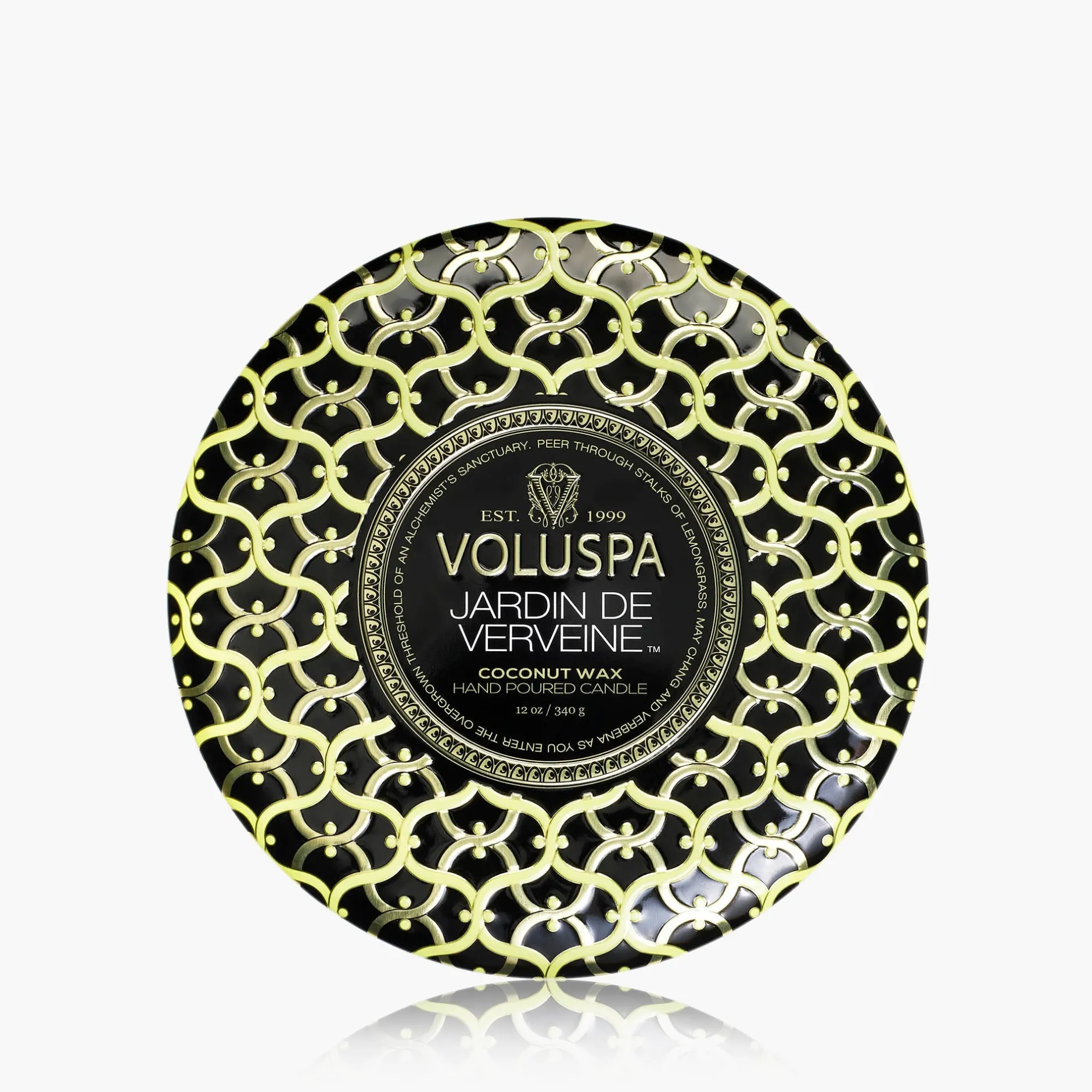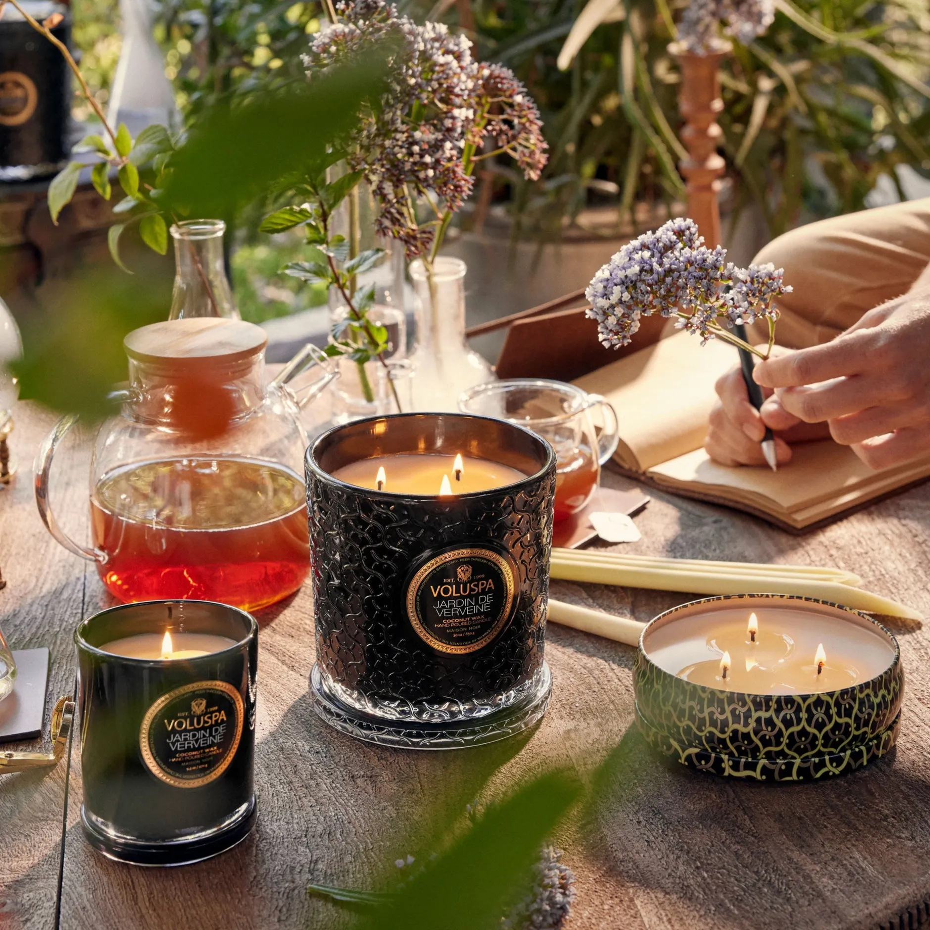 Voluspa’s unique coconut wax blend is housed in a 12 oz. metal vessel adorned in Maison pattern and topped with a matching lid that keeps the candle dust-free when not in use. Our three wicks allow you to enjoy fragrance ample fragrance throw for 40 hours. Our candles are handcrafted in the United States and feature our proprietary, clean-burning coconut wax blend and natural wicks. Our products are free of phthalates, parabens and sulfates and are never tested on animals. Up-cycle this best seller into a keepsake after the last burn.