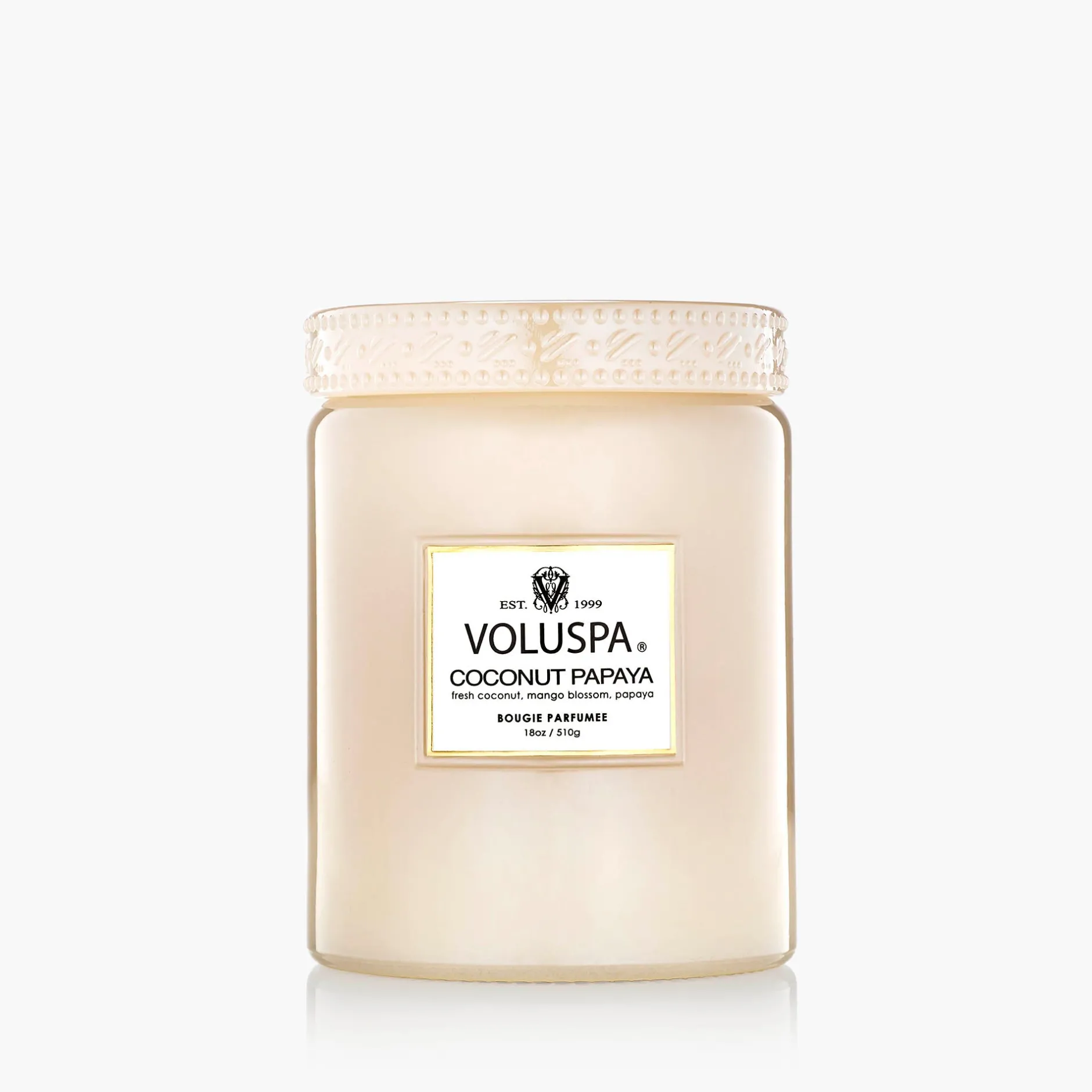Voluspa’s unique coconut wax blend is housed in a 18 oz. glass with linings of mirrored gold glass, metallic accented exterior, and topped with an glass art deco star embossed lid. The single wick allows you to enjoy fragrance throw for 100 hours. Our candles are handcrafted in the United States and feature our proprietary, clean-burning coconut wax blend and natural wicks. Our products are free of phthalates, parabens and sulfates and are never tested on animals. Up-cycle this best seller into a keepsake after the last burn.