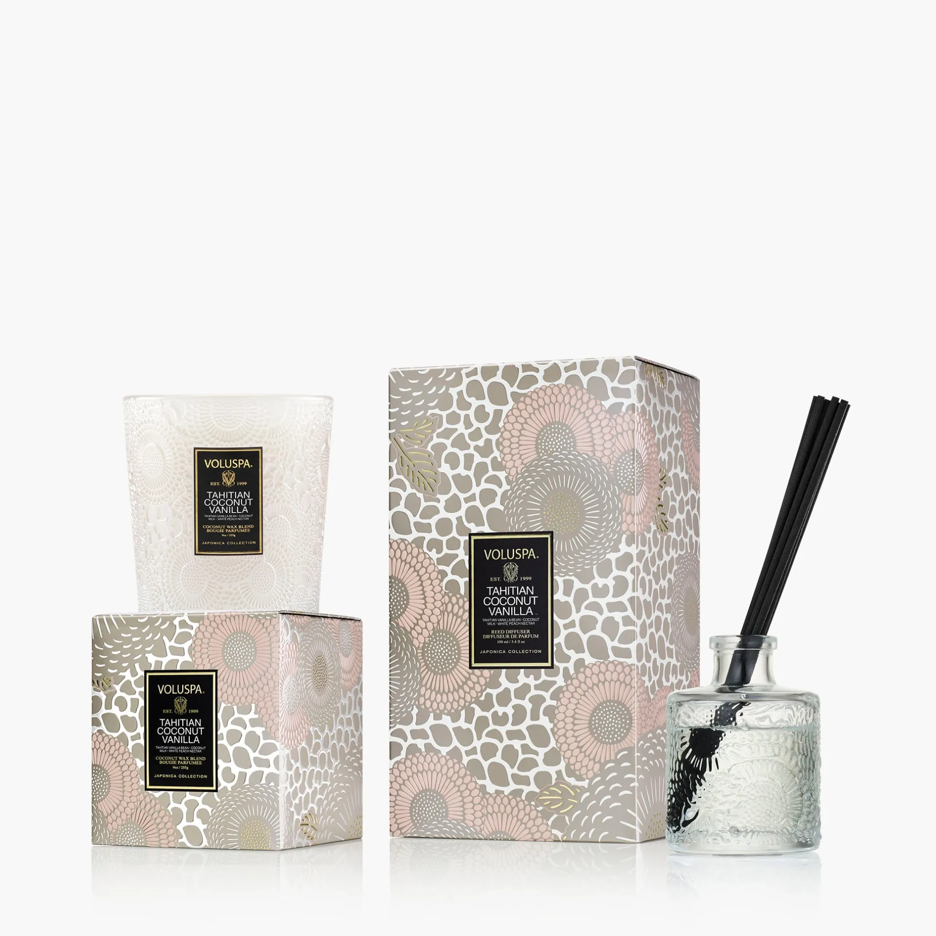 Paradise is just steps away this summer, enjoy the essential duo of our Tahitian Coconut Vanilla Classic Candle & Reed Diffuser.