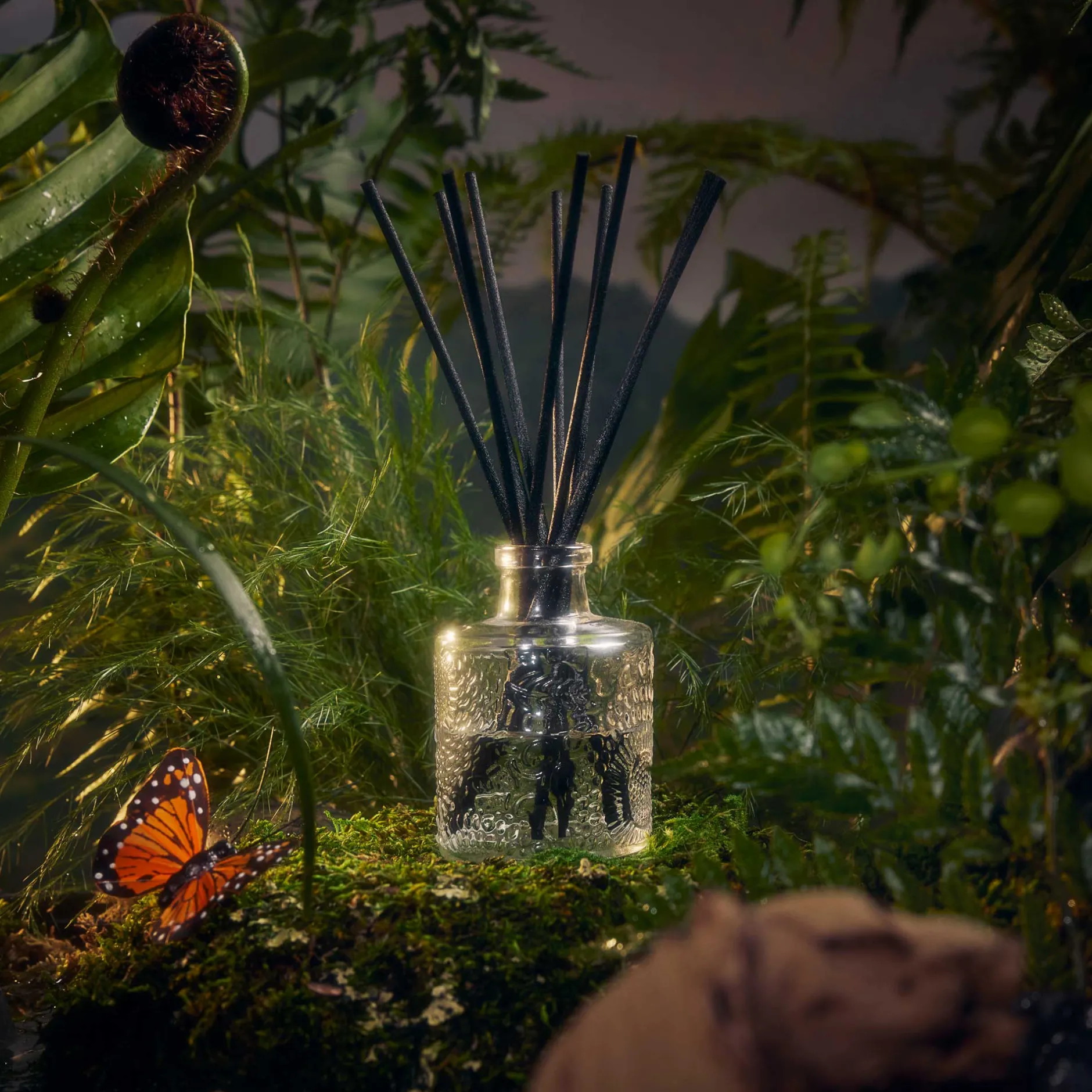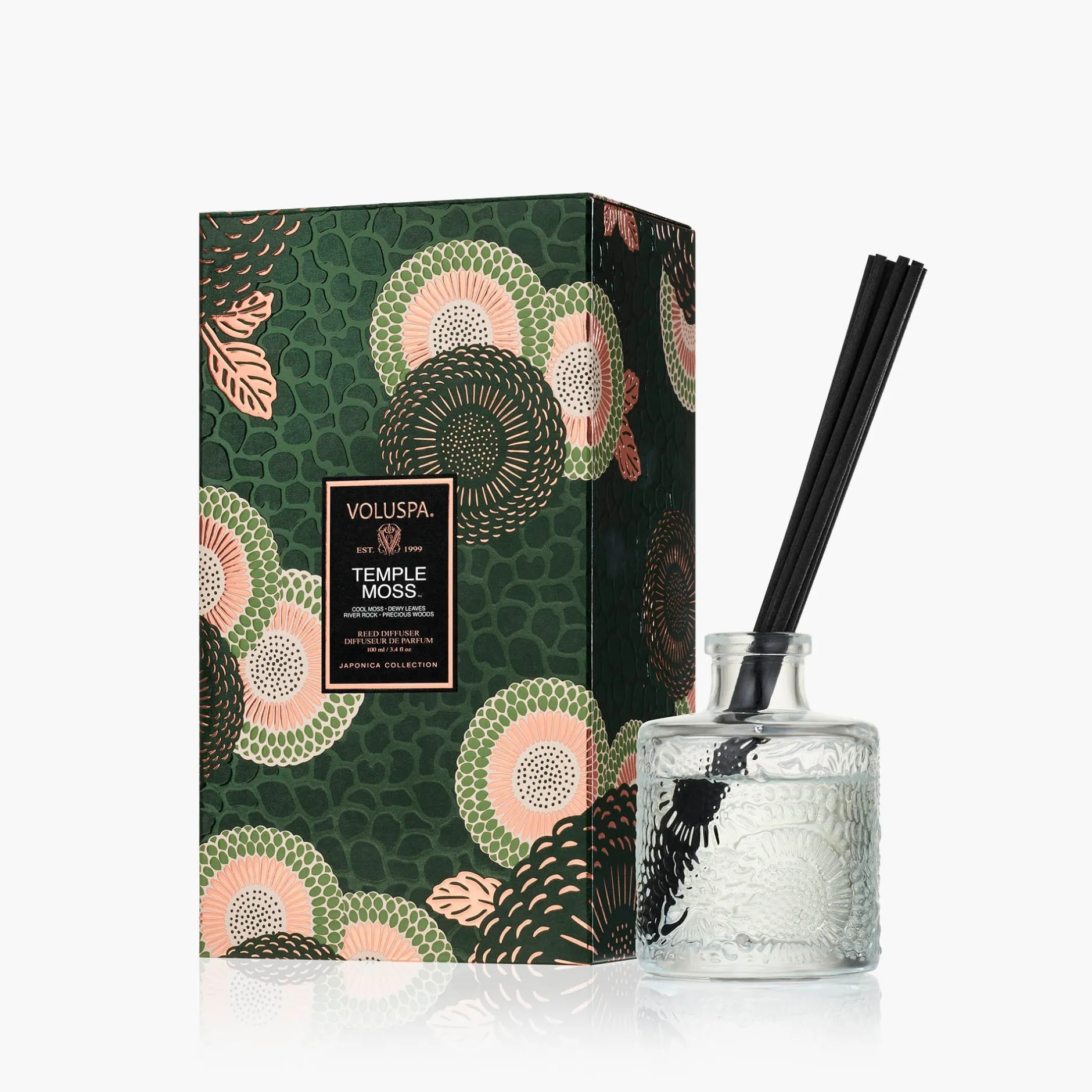 Voluspa invites you to seek solace in the forest floor. Ground down in the healing notes of cool moss, dewy leaves, wet stones and warm sun peeking through the thicket of Hinoki branches. The Master Perfumer herself, Mother Nature, will guide you to tranquility through rhythmic sights, sounds andscents of her lush forest. All are welcome to wander the aromatic grounds of Temple Moss.